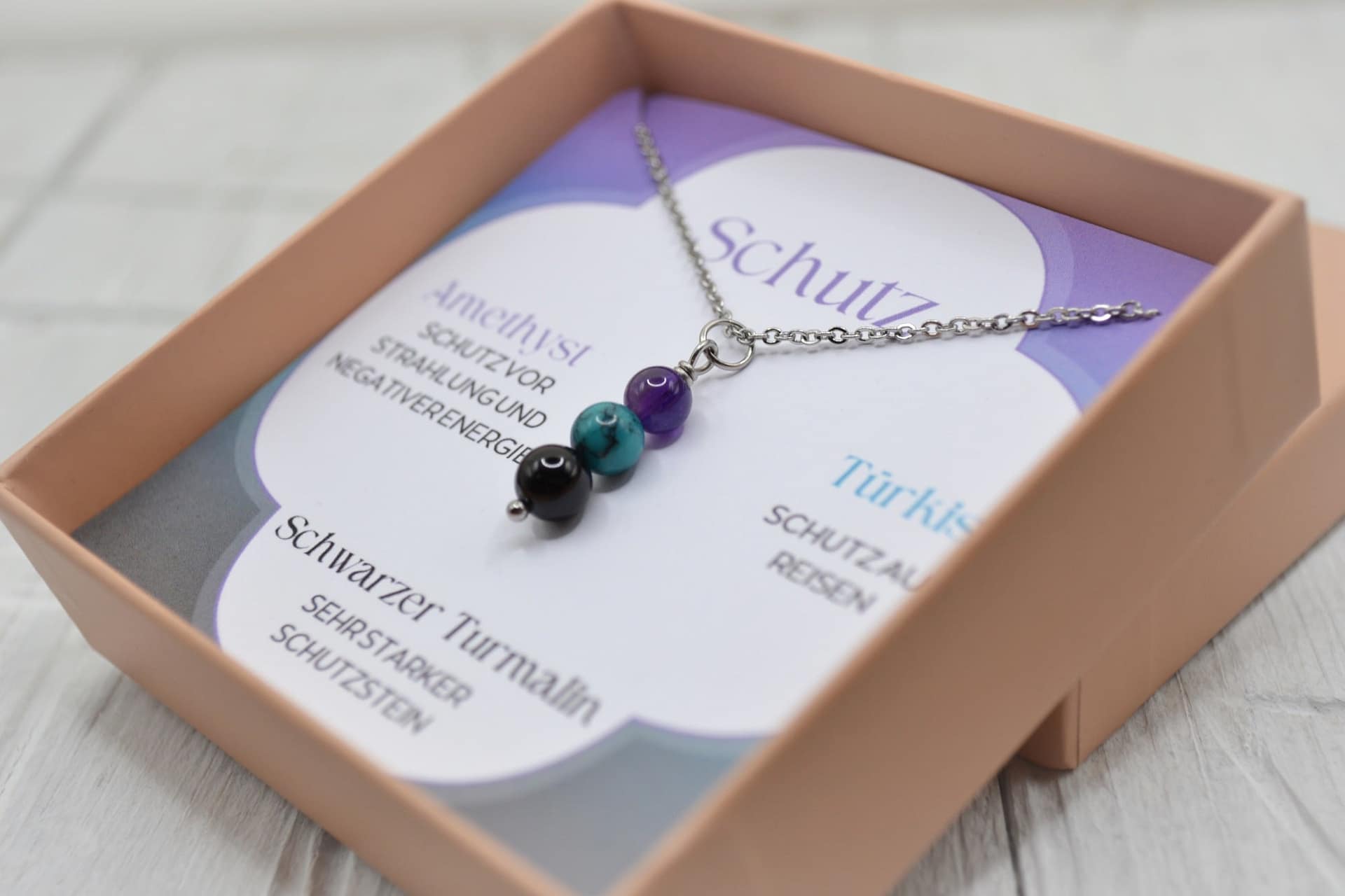 Zur Schmuckpflege habe ich hier alles zusammen geschrieben: *klick* Da einige Steine nicht mit Wasser gereinigt werden sollen empfehle ich, die Steine einfach mit einem Tuch abzuwischen. Die Edelstahlkette kannst du gerne unter fließendem Wasser reinigen.